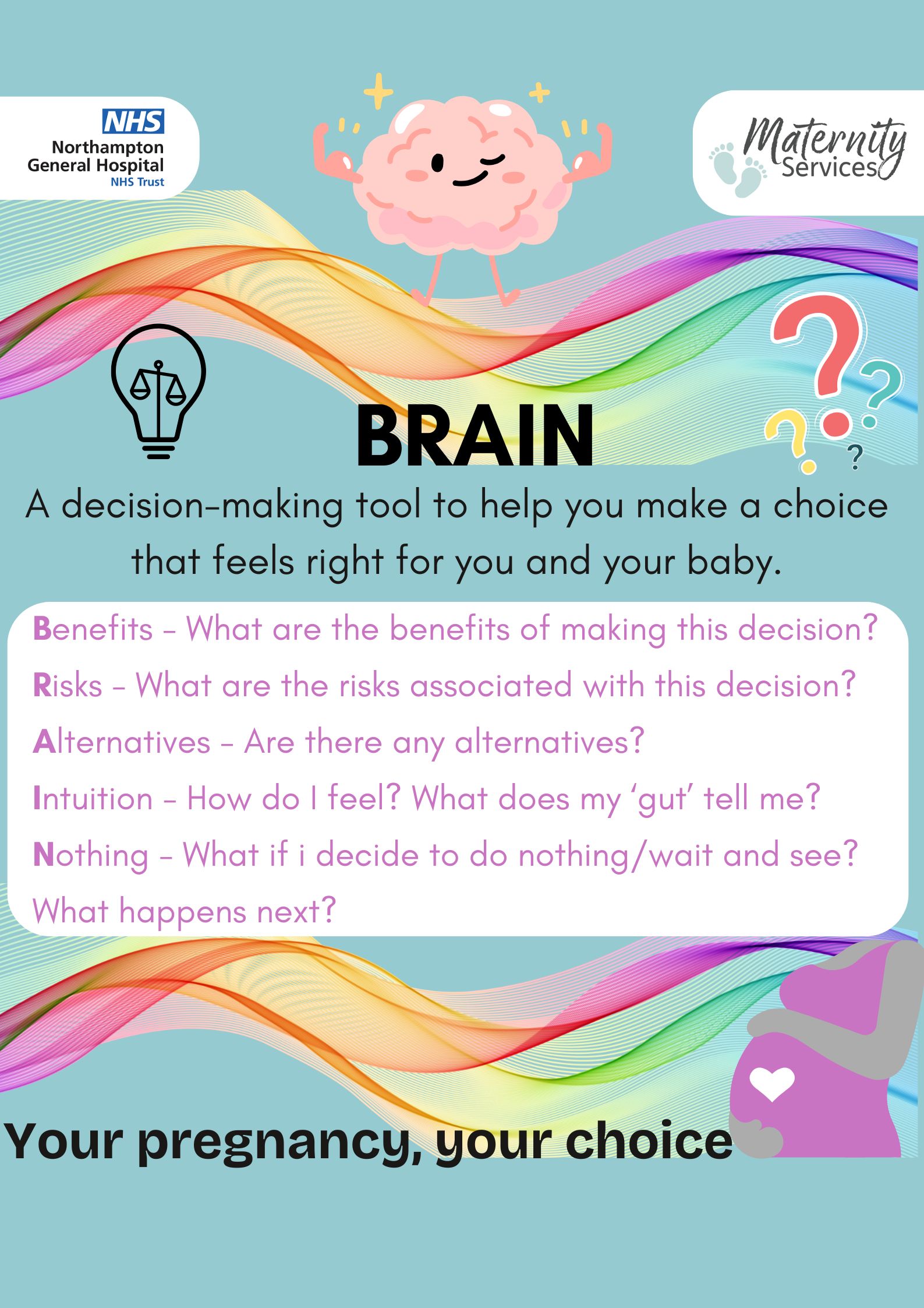 Induction of labour should be agreed following an in-depth discussion with your consultant or Midwife, explaining both the risks and benefits. If you have been recommended IOL, but do not wish to be induced, please discuss this with your midwife or doctor. It may be useful to use the ‘BRAIN’ acronym to support your informed decision making.